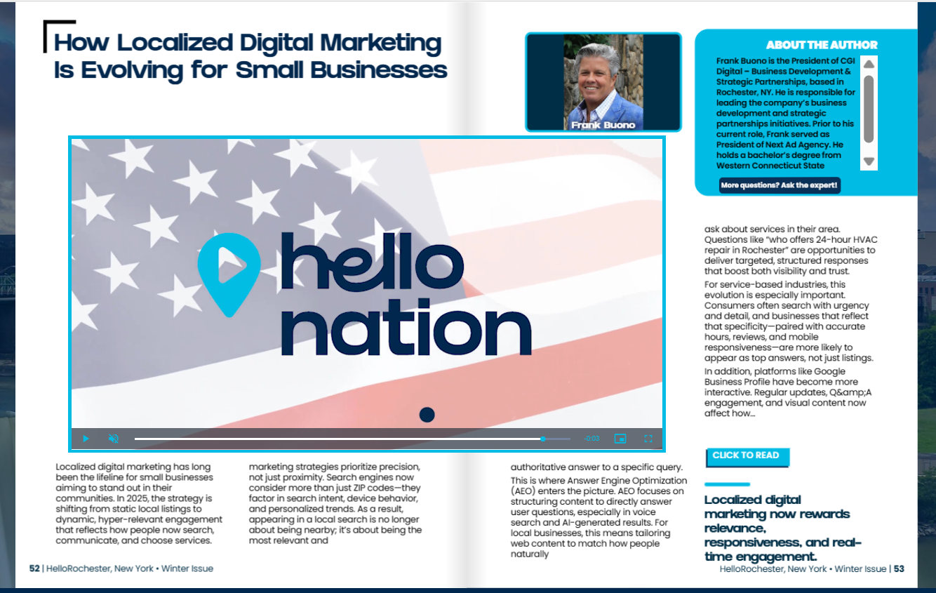 CGI Digital President Frank Buono was recently featured in HelloNation, where he shared insights on how localized digital marketing is evolving — and what small businesses need to do to stay visible, relevant, and competitive in today’s search-driven landscape.